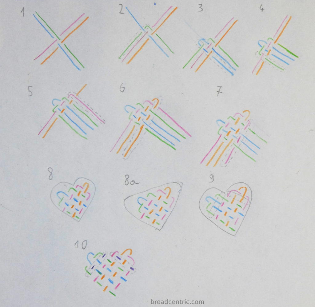 - Bend strip 2 by 90 degrees again and braid under the strip 3 and over the strip 4
