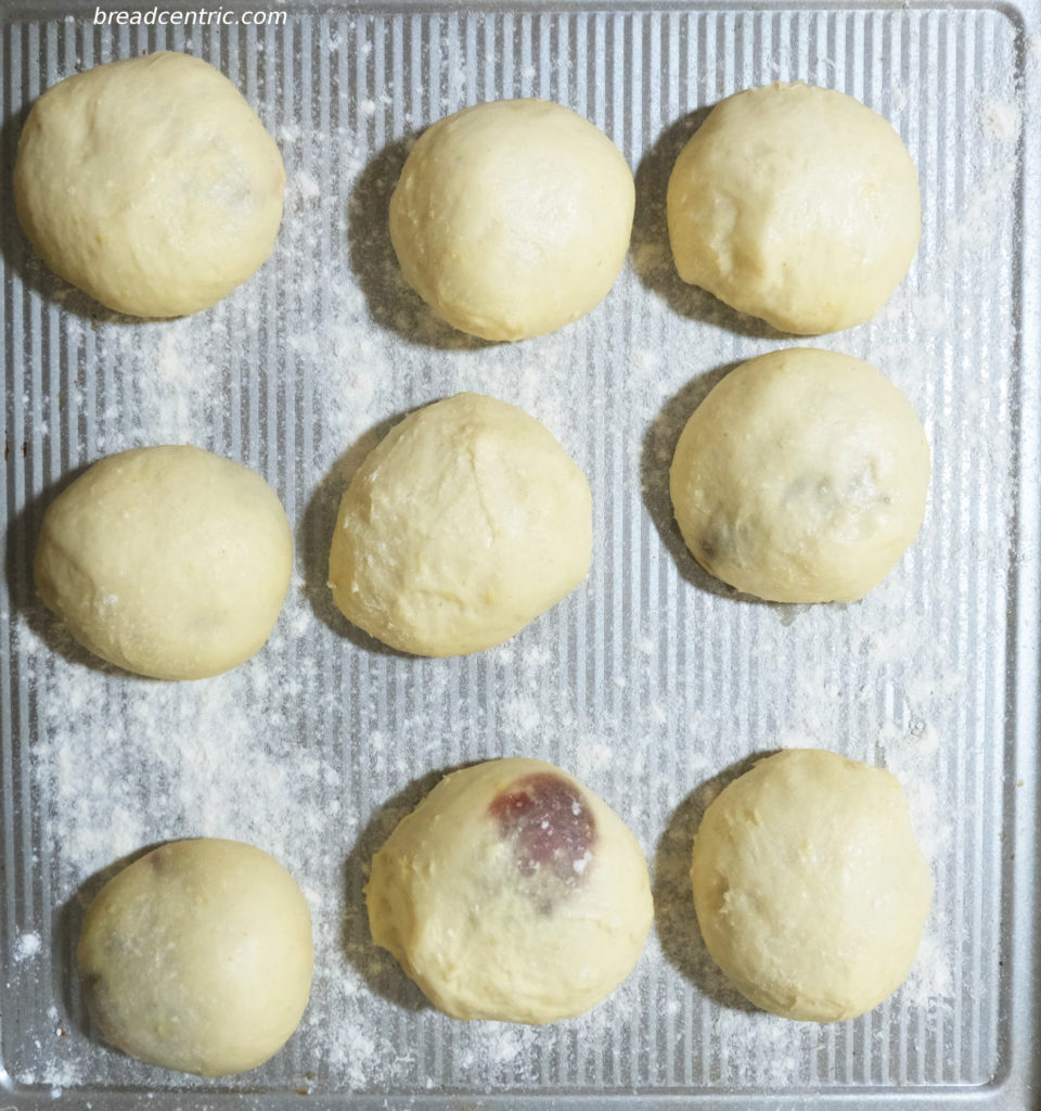 Next day, cut the dough in 50 g pieces, make them flat, put jam in the middle, close them firmly and round to form a nice tight ball. The dough is sticky as hell, so dusting with wheat flour is encouraged. It’s also easier to round empty doughnuts, as with jam you can easily get it through on the other side of the dough and not to close it properly