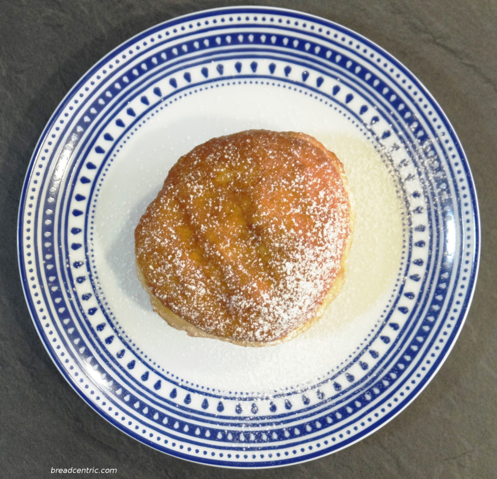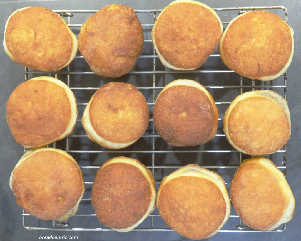Put doughnuts in the pan, enough to have the space to rotate. Picking up must be gentle. Make sure the doughnut does not tear or deflate. Fry for 2 minutes on each side, until golden brown. Keep monitoring the temperature – I keep the probe in the pan all the time