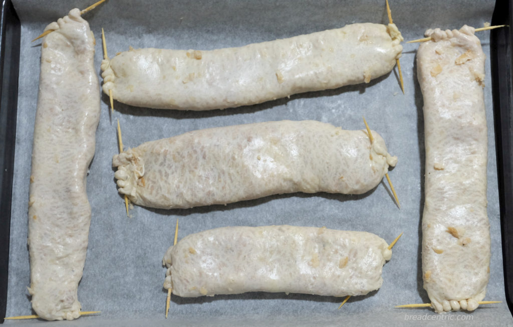 It is very important not to overload or puncture the intestines, otherwise they will burst. This time I filled them very loose, sometimes even too loose. Some burst anyway, but mainly due to sticking to the tray.